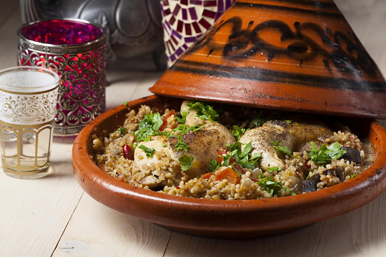 Los platos tradicionales son los tallines ( un guiso de carne o pescado con frutas o verduras) , el cuscús con cordero, pollo, vegetales o huevo, las ensaladas, salchichas y las albóndigas.